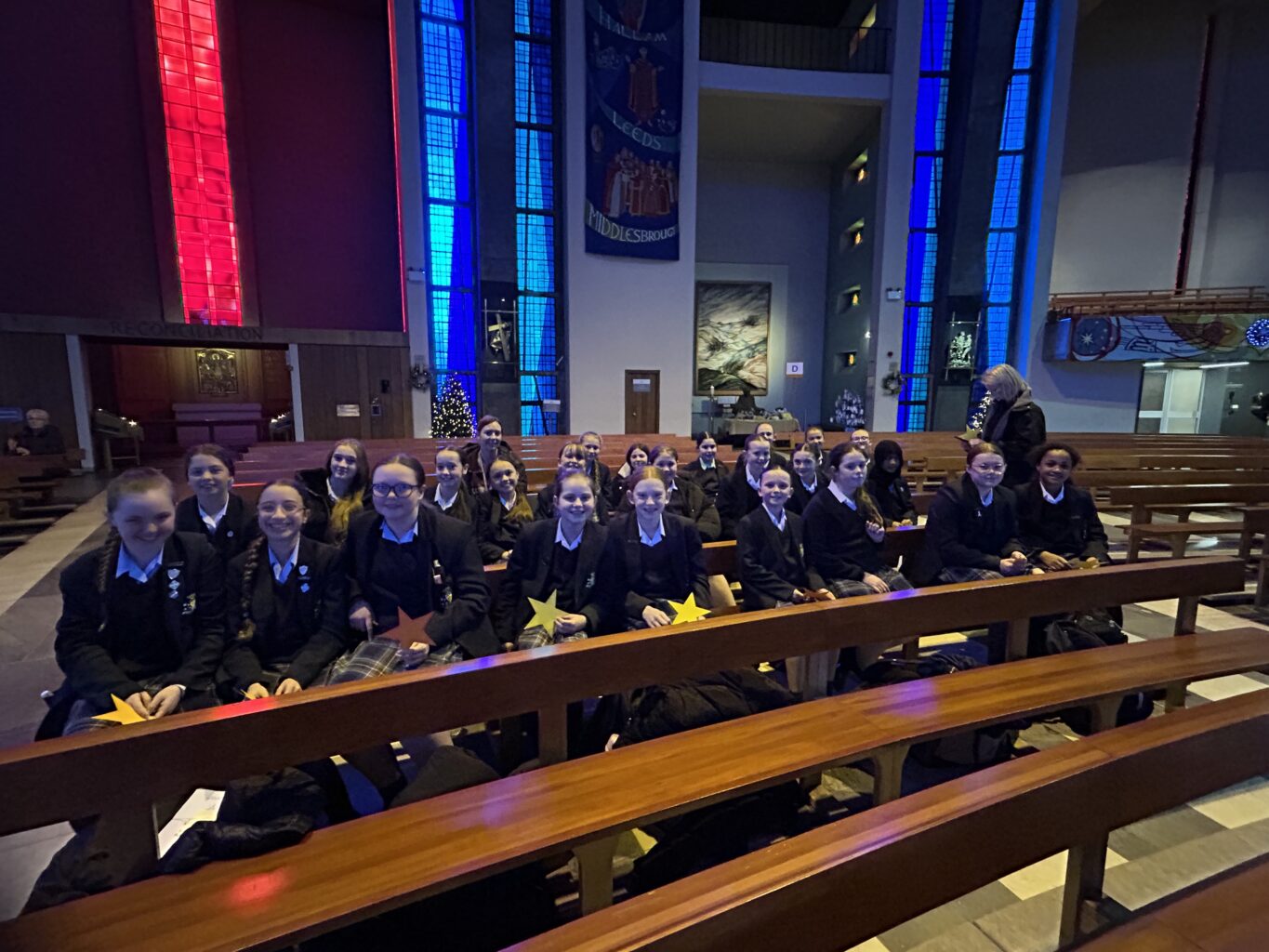 On Wednesday, student representatives from Y7, 8 and 9 went to the Metropolitan Cathedral for the annual Schools’ Advent Service. Primary and secondary schools from across the Archdiocese gathered to watch an entertaining retelling of the Nativity story through song, dance and a few bad jokes!