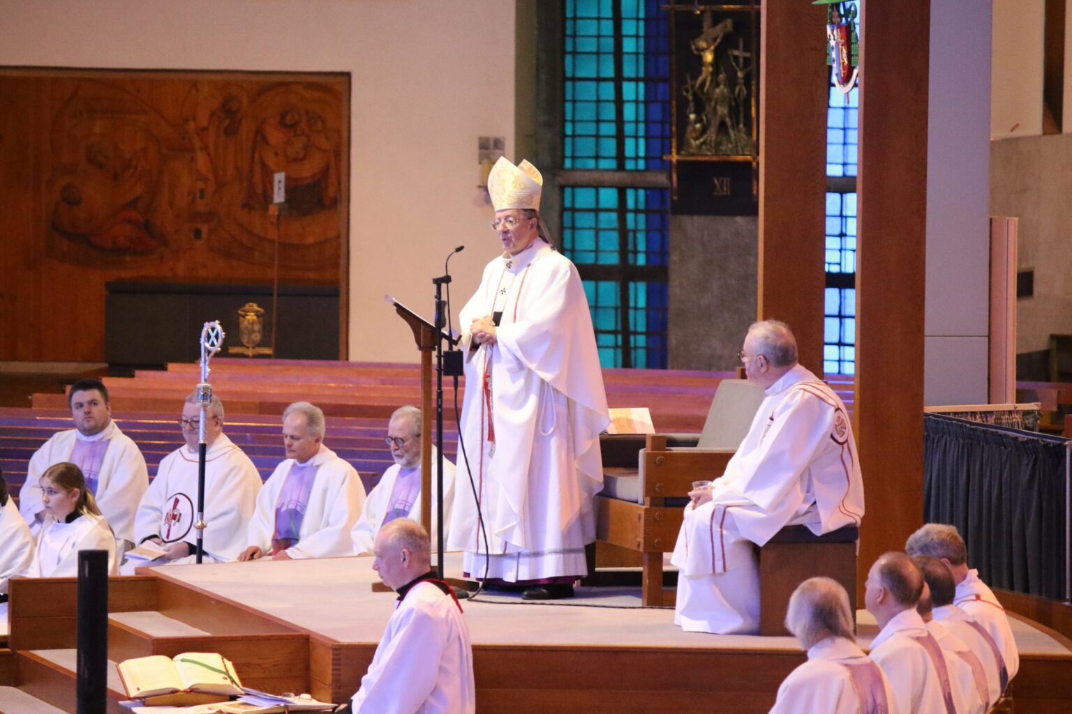 The Mass was celebrated by Archbishop John Sherrington, accompanied by our local deanery priests, Fr Ed Cain, Fr Tim Buckley, Fr Stephen Pritchard, Fr Colin Fealey, Fr Peter McGrail, Fr Peter Murphy, Fr David Potter and Fr Aidan Prescott, with Fr Tony O’Brien from the Cathedral and Fr Mike Fitzsimmons and Deacon Paul Mannings from the Archdiocesan Education Department.